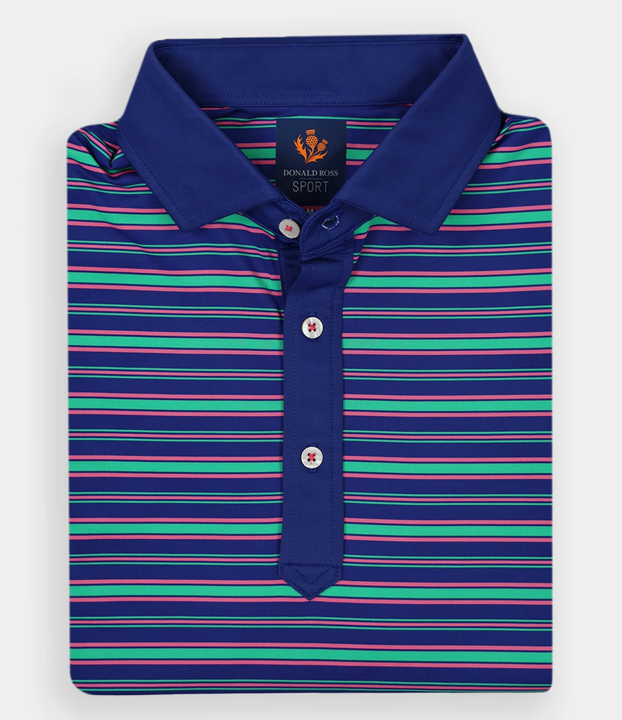 The Blake Men’s Stripe Jersey Polo by Donald Ross Sportswear combines style and performance. This stylish short sleeve features a three-color multi-stripe design, available in three color ways. Perfect for golfers, it delivers both comfort and functionality.
