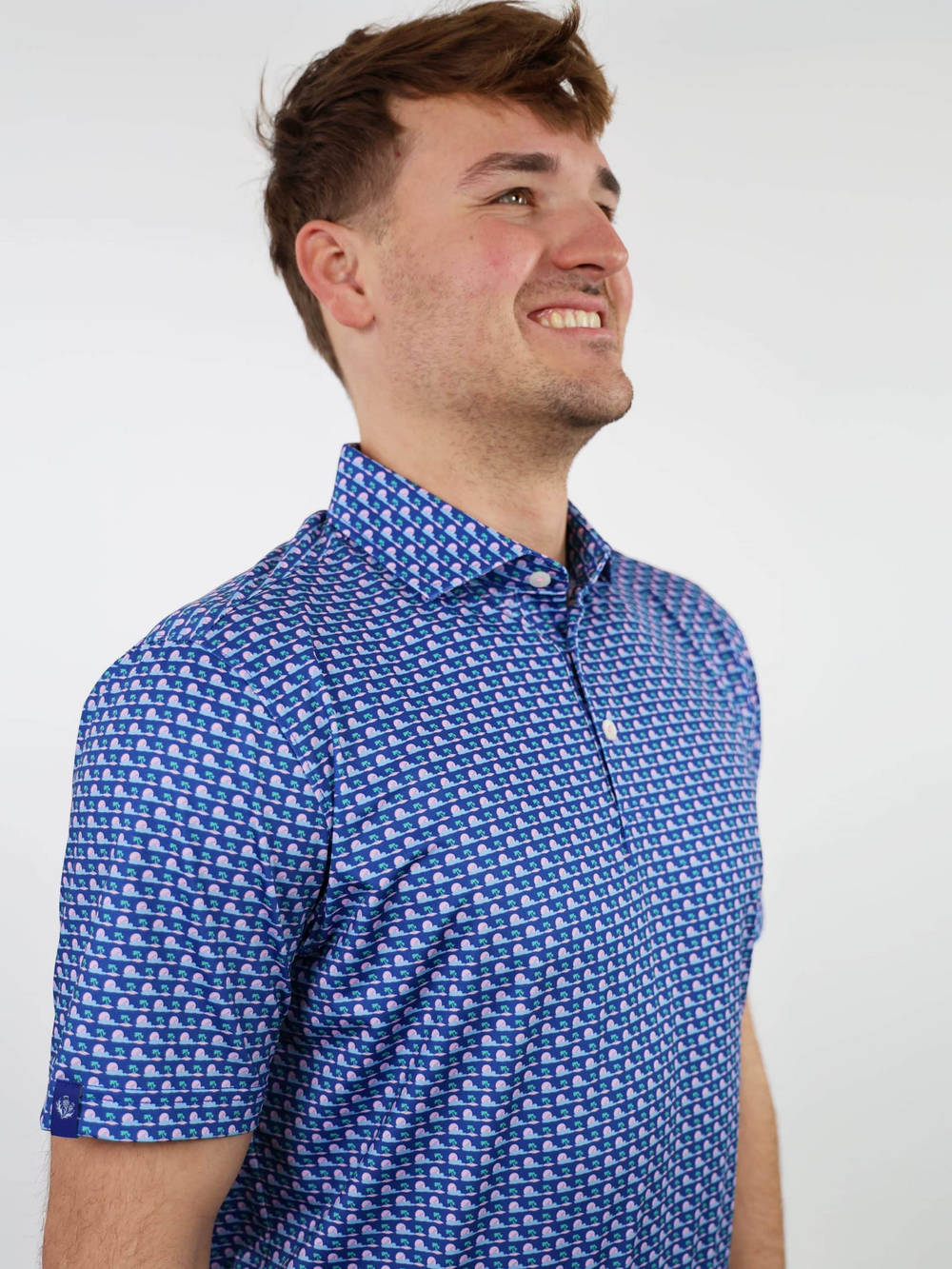 The Roland, Men’s High Tide Print Polo by Donald Ross Sportswear. The Roland features a four-color high tide print polo offered in five unique color ways. Constructed from our performance jersey fabric, this garment also feels cool to the touch and stays dry with moisture-wicking fabric. The Roland offers full stretch and breathability for overall comfort on and off the course.
