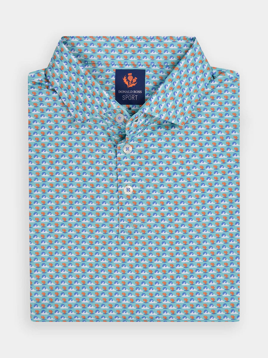 The Roland, Men’s High Tide Print Polo by Donald Ross Sportswear. The Roland features a four-color high tide print polo offered in five unique color ways. Constructed from our performance jersey fabric, this garment also feels cool to the touch and stays dry with moisture-wicking fabric. The Roland offers full stretch and breathability for overall comfort on and off the course.