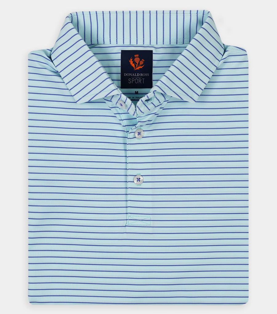 The Ross Fine Line Stripe Polo by Donald Ross Sportswear combines style and performance. This polo features a fine line multi-stripe design, available in five color ways. Made from performance jersey fabric, it feels cool to the touch and remains dry with moisture-wicking fabric. The Ross polo offers full stretch and breathability, ensuring comfort on and off the golf course.