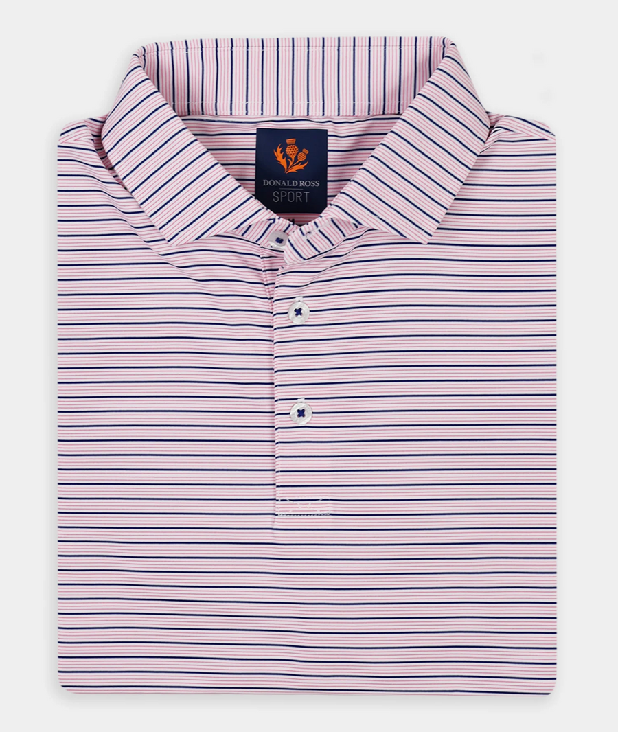The Ross Fine Line Stripe Polo by Donald Ross Sportswear combines style and performance. This polo features a fine line multi-stripe design, available in five color ways. Made from performance jersey fabric, it feels cool to the touch and remains dry with moisture-wicking fabric. The Ross polo offers full stretch and breathability, ensuring comfort on and off the golf course.
