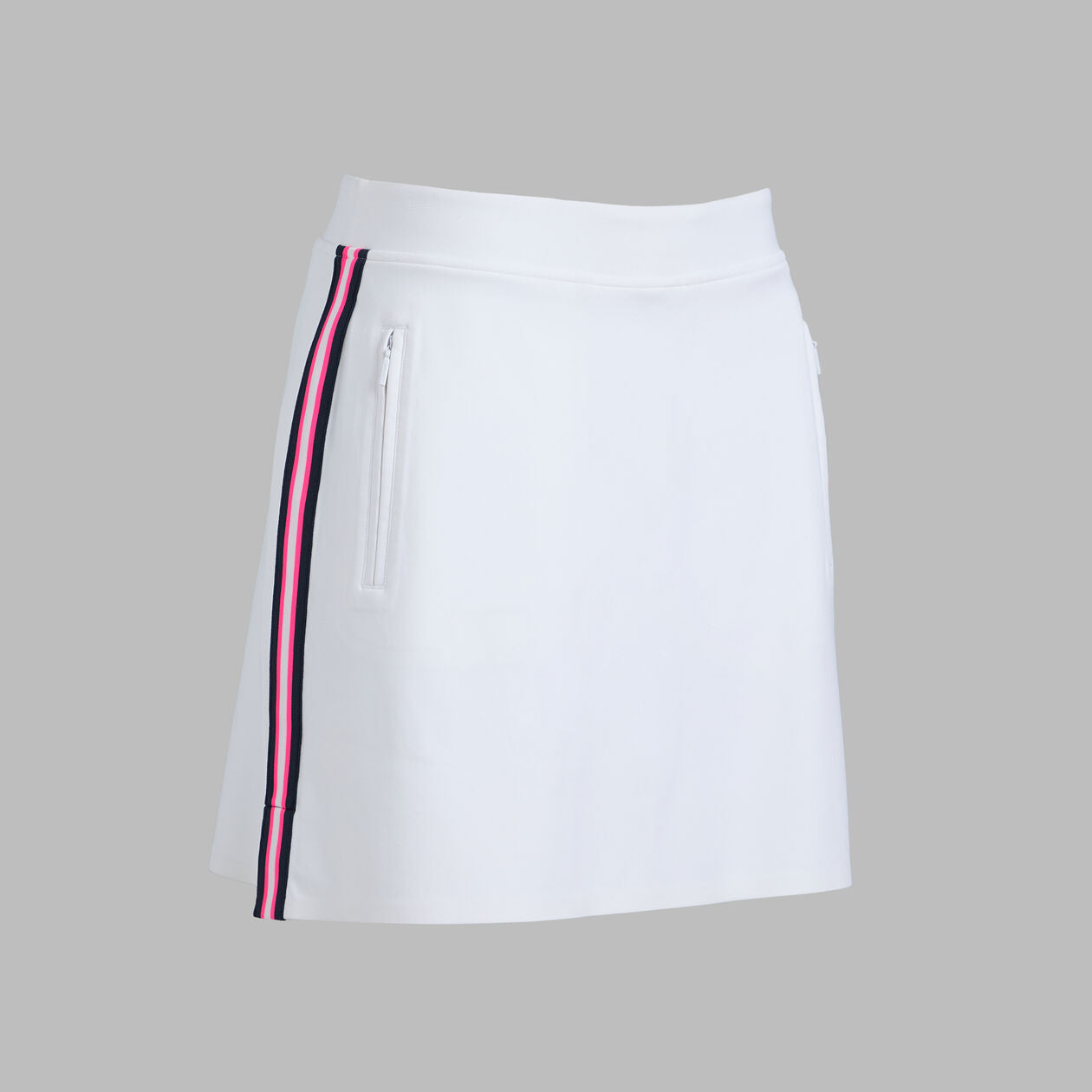 MADE WITH OUR COOLING STRETCH SCUBA FABRIC, THIS STYLISH SKORT HAS LOTS OF STORAGE WITH BUILT-IN SHORTS WITH INTERIOR POCKETS AND TWO ZIPPERED SIDE POCKETS, PERFECT FOR STORING YOUR PHONE, GOLF BALLS, AND OTHER PERSONAL BELONGINGS. PLUS, IT BOASTS MOISTURE-WICKING TECHNOLOGY, ENSURING YOU STAY FRESH AND DRY ALL DAY LONG, WHETHER YOU'RE SPENDING IT ON THE COURSE OR PICKLEBALL COURT. PAIR IT WITH A SLEEVELESS POLO FOR THE QUINTESSENTIAL SUMMER VIBE.