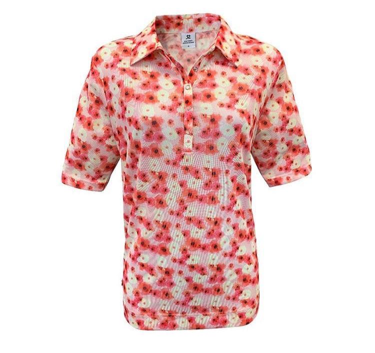 A printed floral mesh style 1/2 sleeve polo shirt. An ideal top for those who prefer to have their arms covered a bit, but who do not want to feel too warm. This polo is moisture wicking and comes in a relaxed fit.