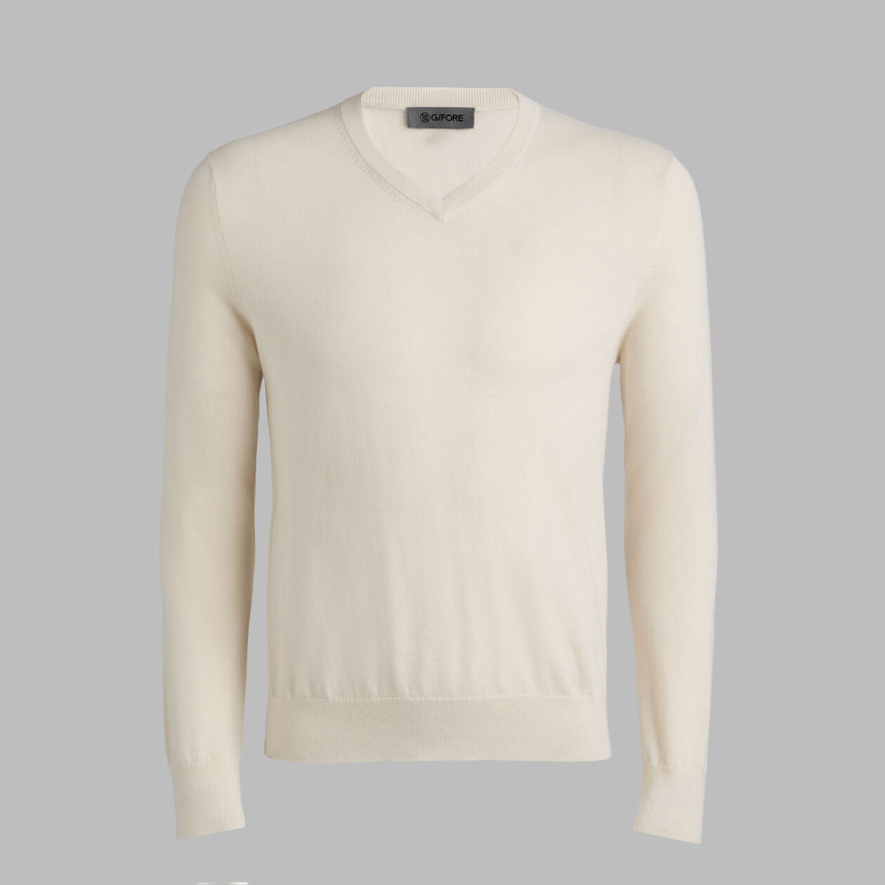 YOU'RE NOT A GOLF ENTHUSIAST WITHOUT A V-NECK SWEATER. MADE OF ULTRA SOFT, LIGHTWEIGHT CASHMERE, THIS PLAYER'S ESSENTIAL IS PERFECT FOR THE COURSE AND CLUBHOUSE LIFESTYLE. IT GOES GREAT WITH ONE OF OUR STRAIGHT LEG PANTS—STYLE COULDN'T GET MORE EFFORTLESS.